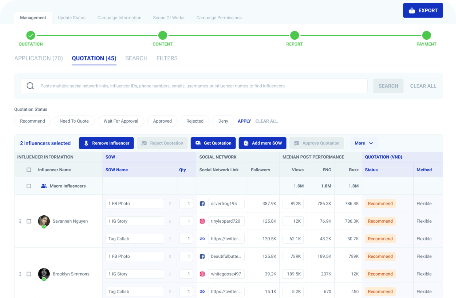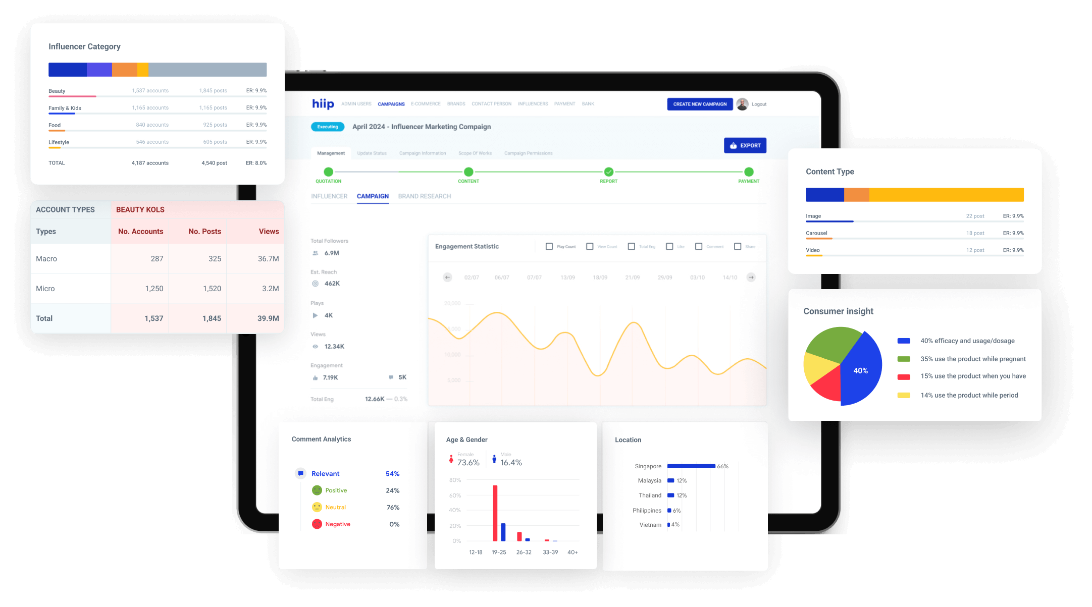 Streamline your campaign workflow with an end-to-end platform which consolidates influencer activation, quotation proposal, content collaboration and campaign performance reporting including ROI and AI-powered consumer perceptions and sentiment. Say goodbye to endless email threads and cumbersome Excel sheets, paving the way for efficiency and clear communication.