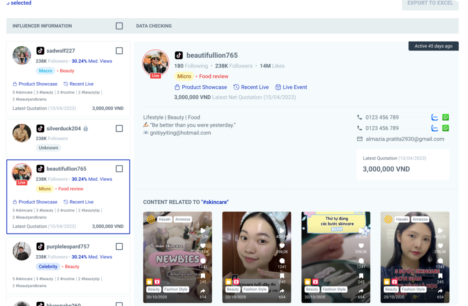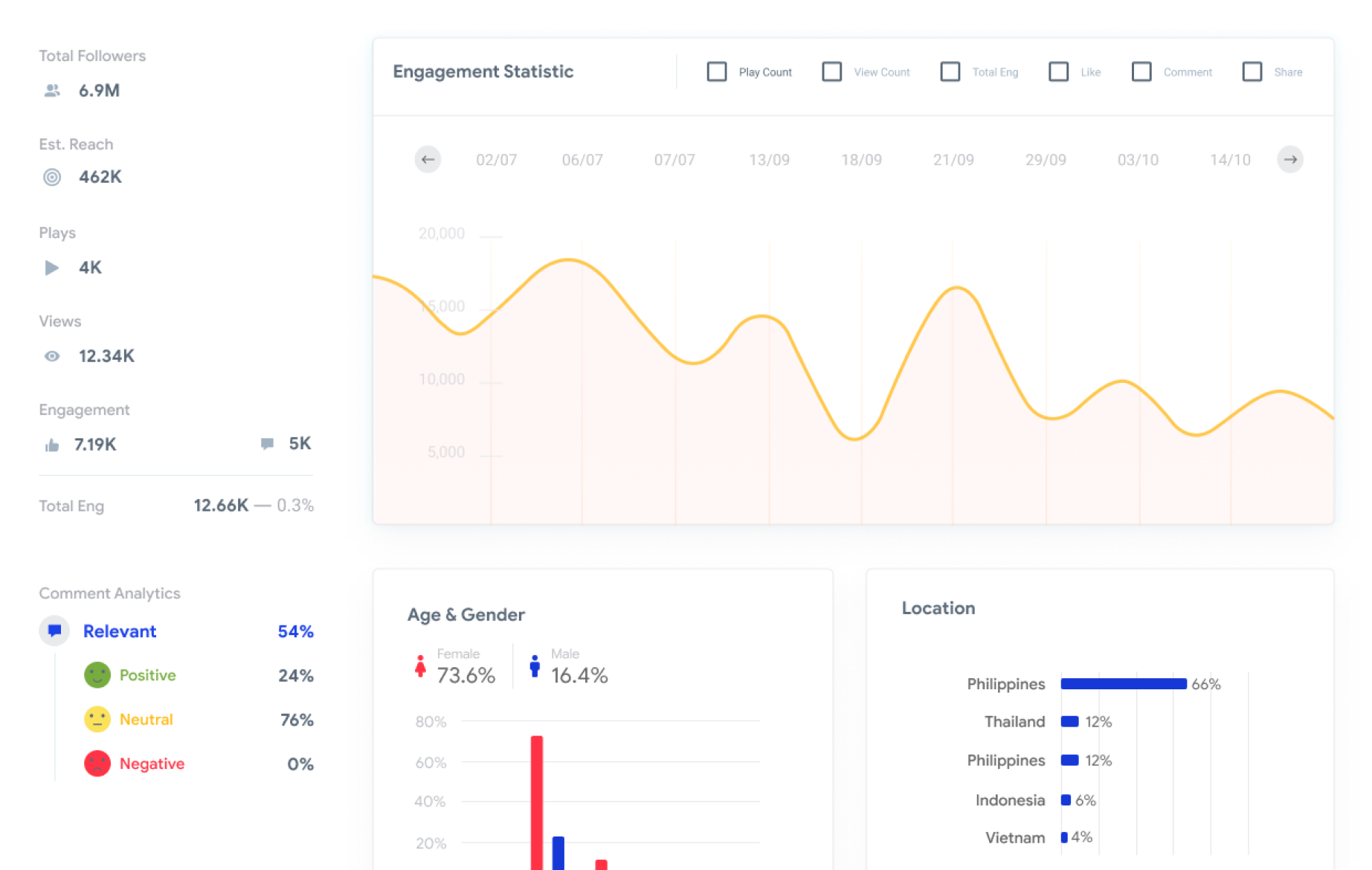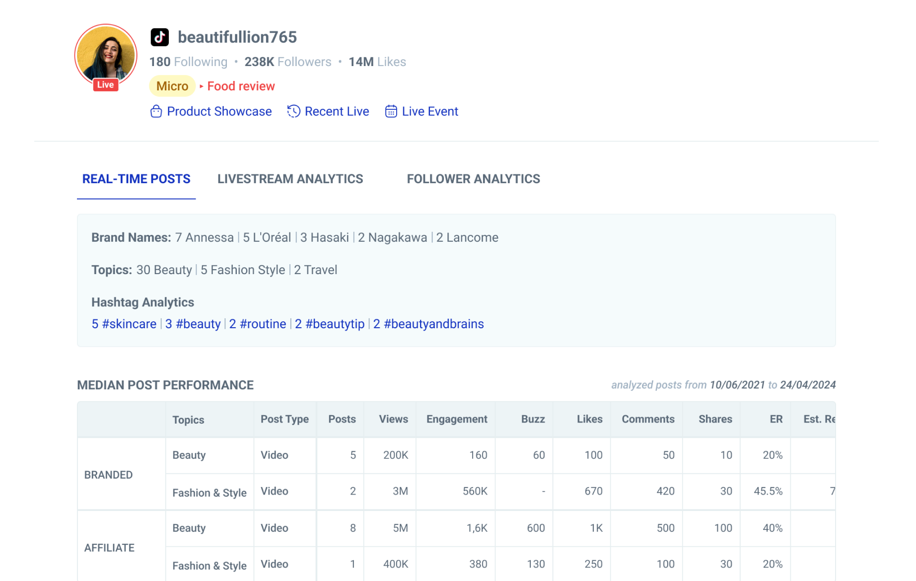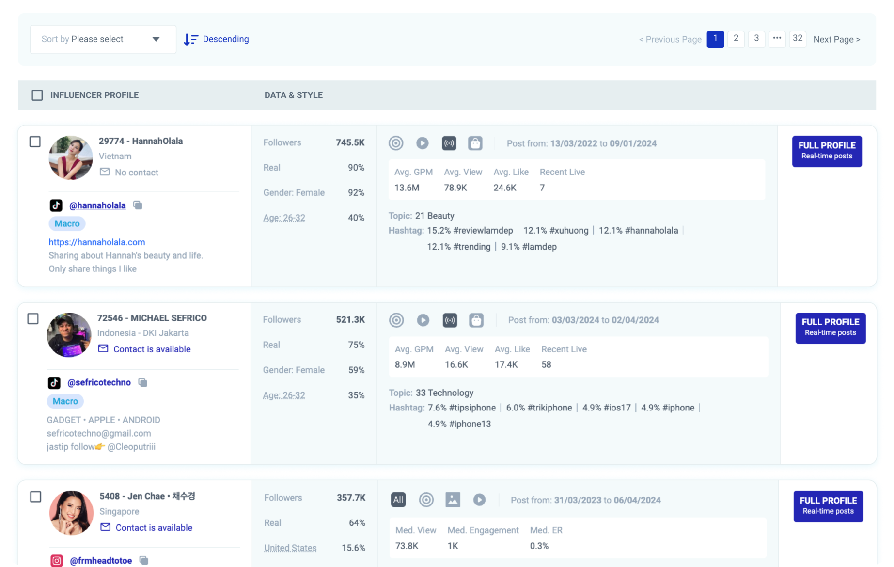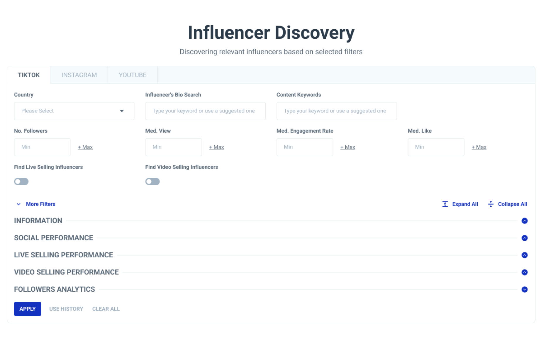 Our AI-powered Influencer Discovery and Analytics tools help brands and agencies effectively search, filter, and select the right influencers. These tools provide a complete portrait of an influencer, including branded content performance, live-selling ability, and follower authenticity detection.